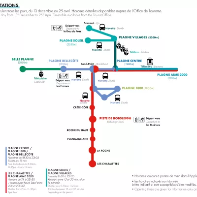During the winter season, free shuttles between the high-altitude resorts of Plagne Centre - Plagne 1800 - Plagne Bellecôte run from 8:30 a.m. to 11:35 p.m. (from December 13).