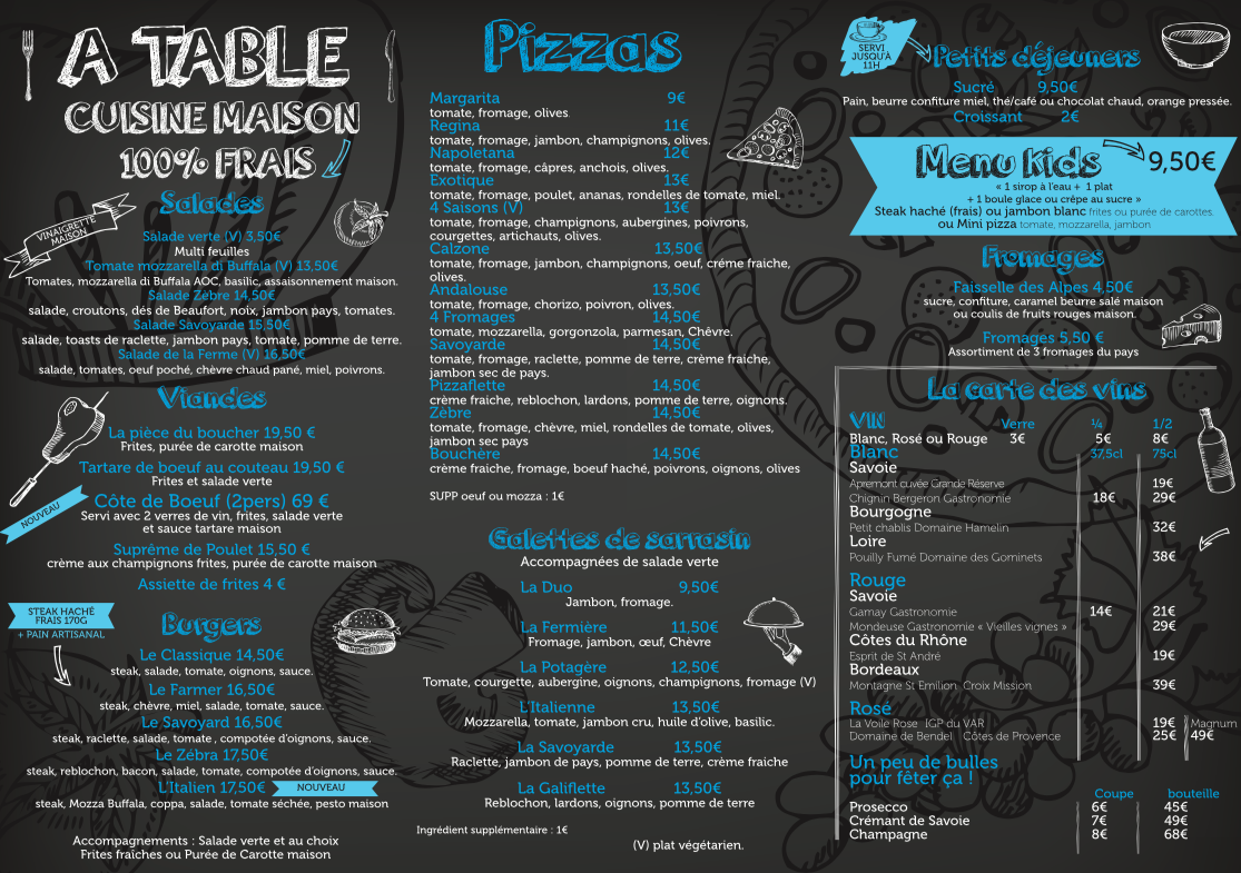From breakfast to lunch and dinner, not forgetting snacks and aperitifs, Les 2 Zèbres welcomes you from morning to evening, 7/7. Don't forget to book!
