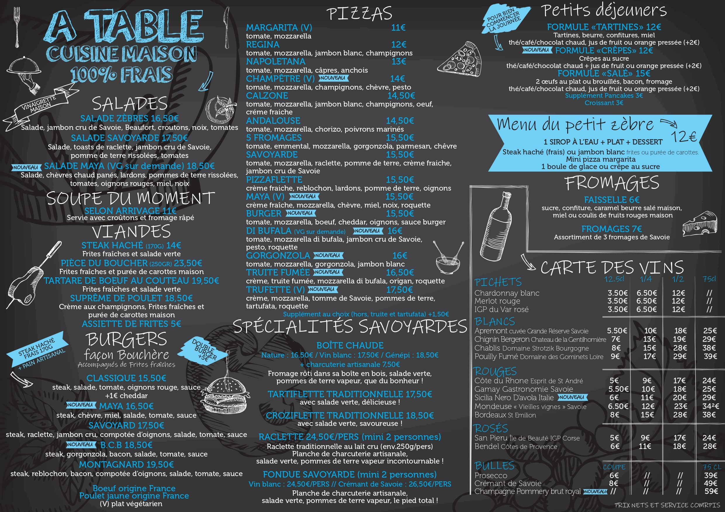 From breakfast to lunch and dinner, not forgetting snacks and aperitifs, Les 2 Zèbres welcomes you from morning to evening, 7/7. Don't forget to book!