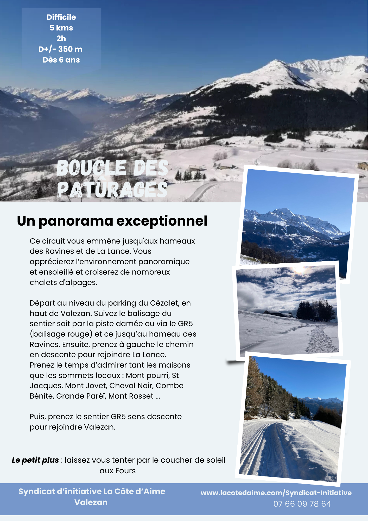 A circuit trail to do on snowshoes that takes you to the little hamlets of Les Ravines and La Lance. You will enjoy the sunny, panoramic surroundings and will see a number of alpine chalets along the way.
